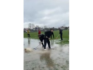 Türkiye Futbol Federasyonu (TFF) 3. Lig 2. Grup'un 25. haftasında oynanan Osmaniyespor FK-Ağrı 1970 Spor karşılaşması öncesinde, yoğun yağış nedeniyle sahada oluşan su birikintilerini taraftar ve görevliler temizledi.