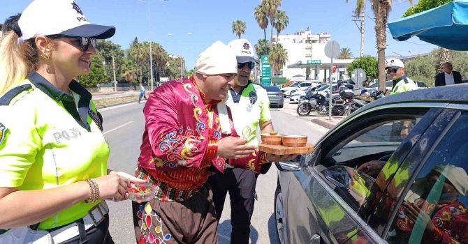 Mersin'in Silifke ilçesinde trafik uygulamasında sürücülere ilçenin tescilli yoğurt ve çileği ikram edildi.