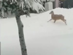 İlçe merkezindeki Seyitaliler Mahallesi'nde kaydedilen görüntüde, bir yaban keçisinin, karla kaplı caddeden koşarak ve zıplayarak geçtiği görülüyor. Yaban keçisi, bir süre etrafına bakındıktan sonra evlerin arasından geçerek yaşam alanı olan dağlık kesimlere doğru gözlerden kayboldu.
