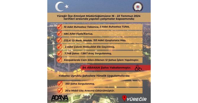 Yüreğir İlçe Emniyet Müdürlüğü ekiplerince son bir haftada gerçekleştirilen çalışmalarda, çeşitli suçlardan aranan 84 şüphelinin yakalandığı bildirildi. 16-22 Temmuz tarihlerinde gerçekleştirilen denetim ve operasyonlarda; 10 ruhsatsız tabanca, 2 ruhsatsız tüfek, 484 fişek-kartuş, 232 gram narkotik madde ile 153 uyuşturucu hap ele geçirildi. Motosiklet ve araçlara yönelik gerçekleştirilen uygulamalar çerçevesinde ilçe genelinde bin 987 araç ve motosiklet sorgulanırken, 2 motosiklet çalıntı halde yakalandı.