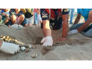 Antalya'nın Kemer ilçesinde jandarma ekipleri, "Caretta Caretta Deniz Kaplumbağaları İlk Yuva Açma Etkinliği" ile yuvadan çıkamayan caretta caretta yavrularını denizle buluşturdu.