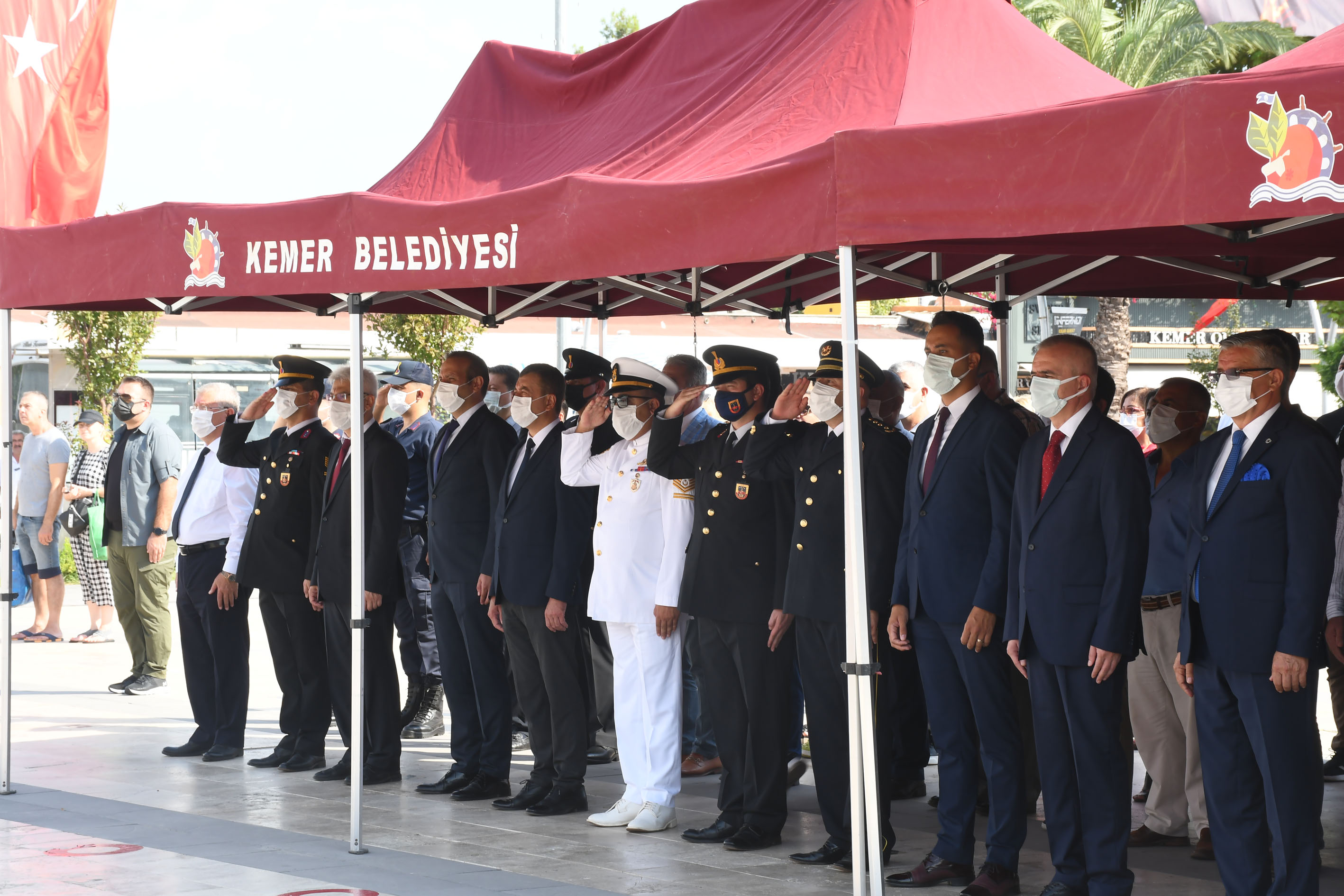 Kemer Cumhuriyet Meydanında düzenlenen törene, Kemer Kaymakamı Yücel Gemici, Kemer Belediye Başkanı Necati Topaloğlu, Kemer Cumhuriyet Başsavcısı İsmail Teker, Kemer Jandarma Komutanı Yüzbaşı Ramazan Ergel, Kemer Emniyet Müdürü Deniz Yılmaz, Kemer Sahil Güvenlik Komutanı Ulvi Gören, Kemer Belediyesi meclis üyeleri Ferhan Fidan, Ramazan Kal, Semih Özdemir, siyasi parti temsilcileri, kurum amirleri, öğretmenler ve öğrenciler katıldı.